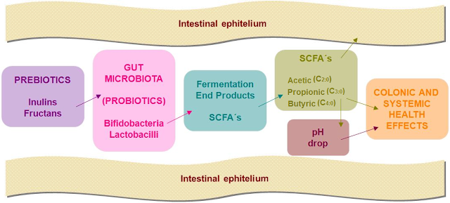 - कोलोन के हितकारी जीवाणु घुलनशील फाइबर का फरमेंटेशन करते हैं और शॉर्ट चेन फैटी एसिड बनाते हैं, जो शरीर में पहुँचा दिये जाते हैं। जो बचते हैं वो जीवाणुओं का भोजन बनते हैं।